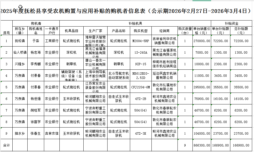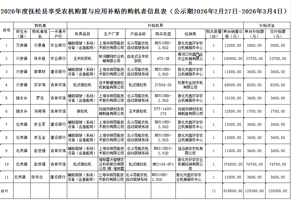 2026年度抚松县享受农机购置与应用补贴的购机者信息表